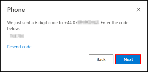 - A 6 digit code will be set to the telephone number you entered, enter the code and select Next (see below)